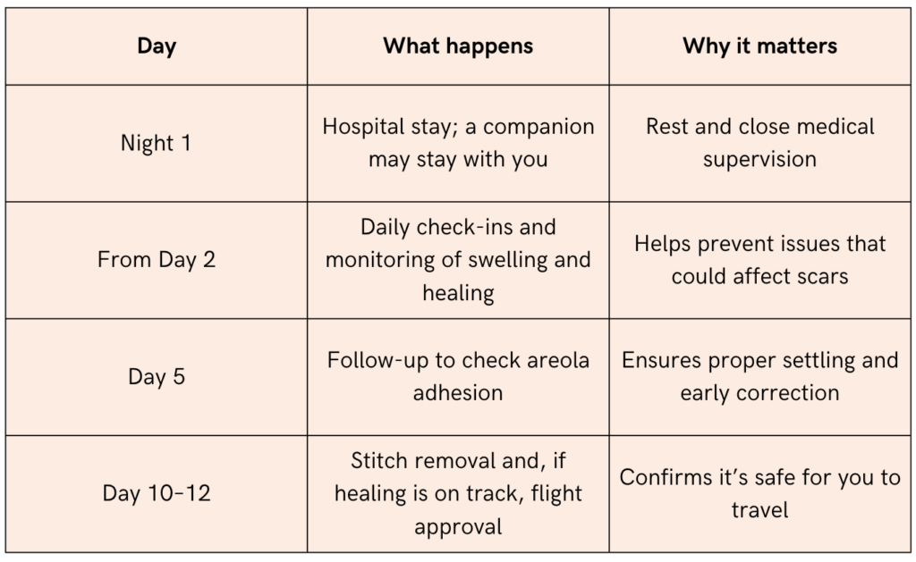Specialist guidance consistently advises to stay in Spain for at least 12-15 days. The early healing window defines scar behavior, areola adhesion, and swelling response.